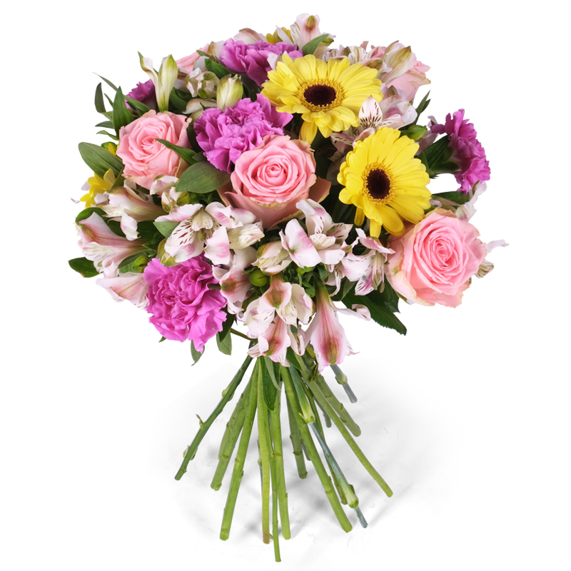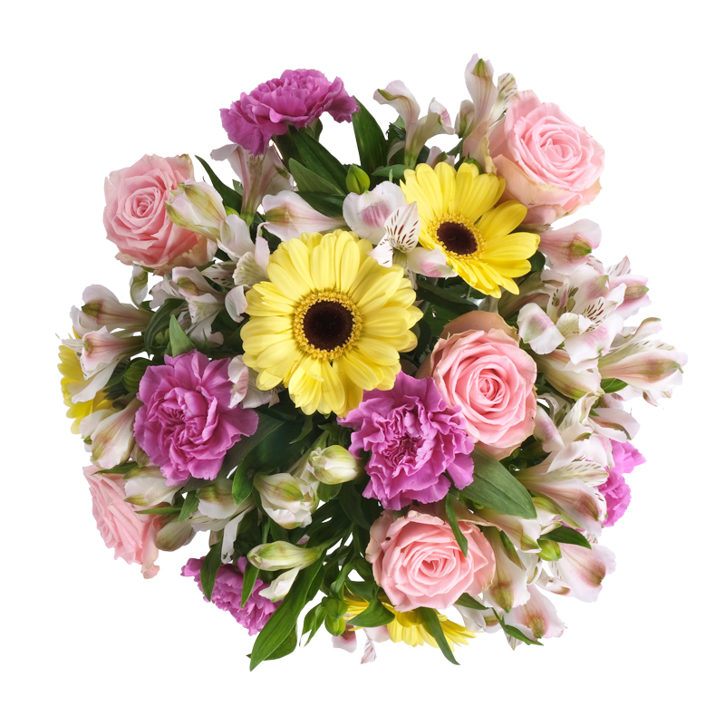Zawsze świeże kwiaty Bukiet subtelności to harmonijna kompozycja róż, gerber, goździków i alstromerii. Róże wnoszą romantyzm, gerbery dodają radości, goździki tworzą pełnię, a alstromerie subtelnie dopełniają całość. Świeże liście otaczają kwiaty naturalną ramą. Idealny prezent wyrażający delikatne uczucia z klasą i elegancją.